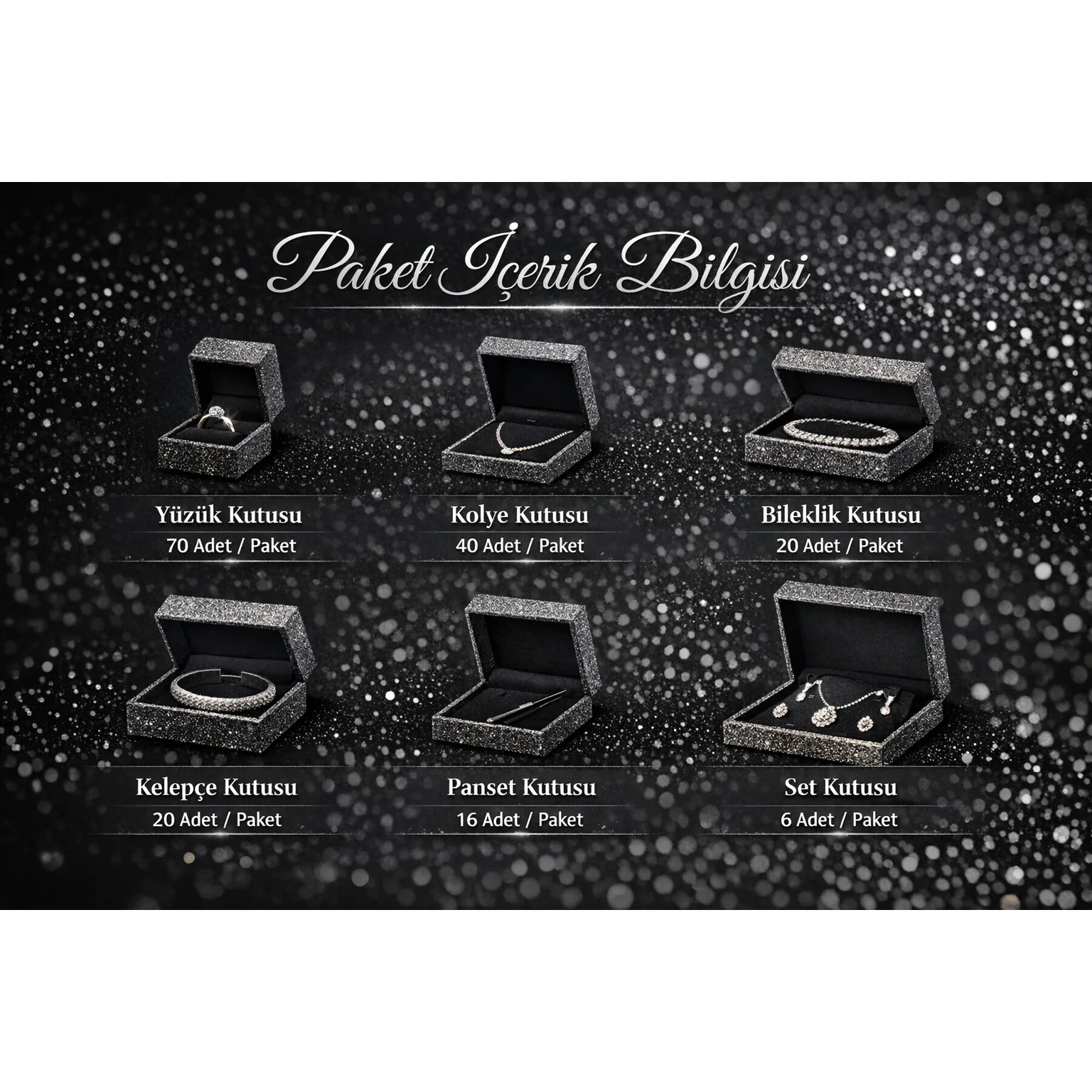 Yüzük Kutusu: 70 adet / paket Kolye Kutusu: 40 adet / paket Bileklik Kutusu: 20 adet / paket Kelepçe Kutusu: 20 adet / paket Penset Kutusu: 16 adet / paket Set Kutusu: 6 adet / paket ❓ Sıkça Sorulan Sorular (SSS)